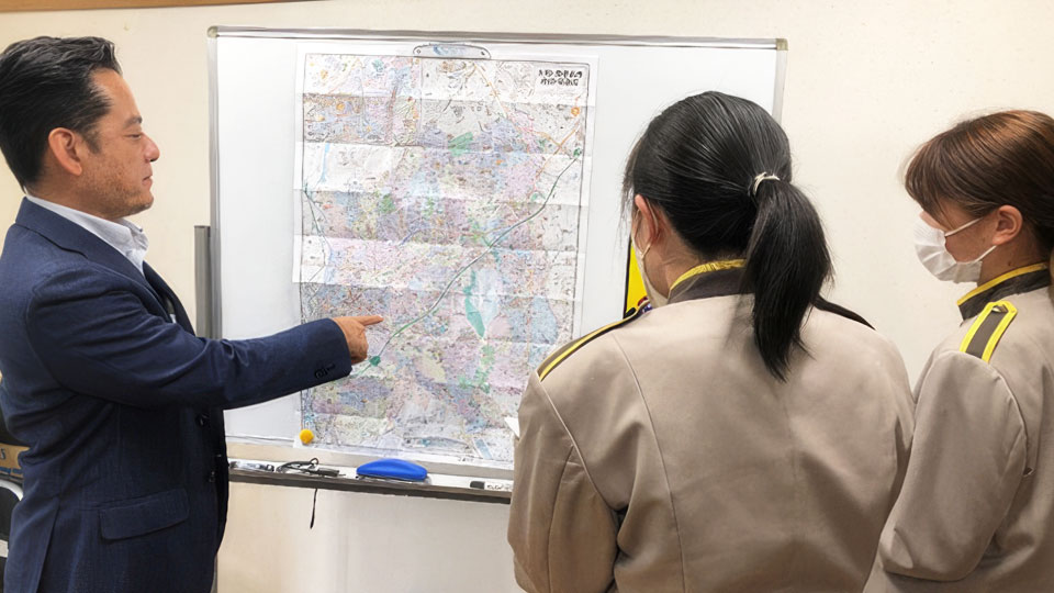 お客様に安心してご利用いただくようしっかりと地理(道路、主な目的地、よくご利用いただく場所など)を中心に、机上での研修と実際にタクシーに同乗しての研修を行っています。
